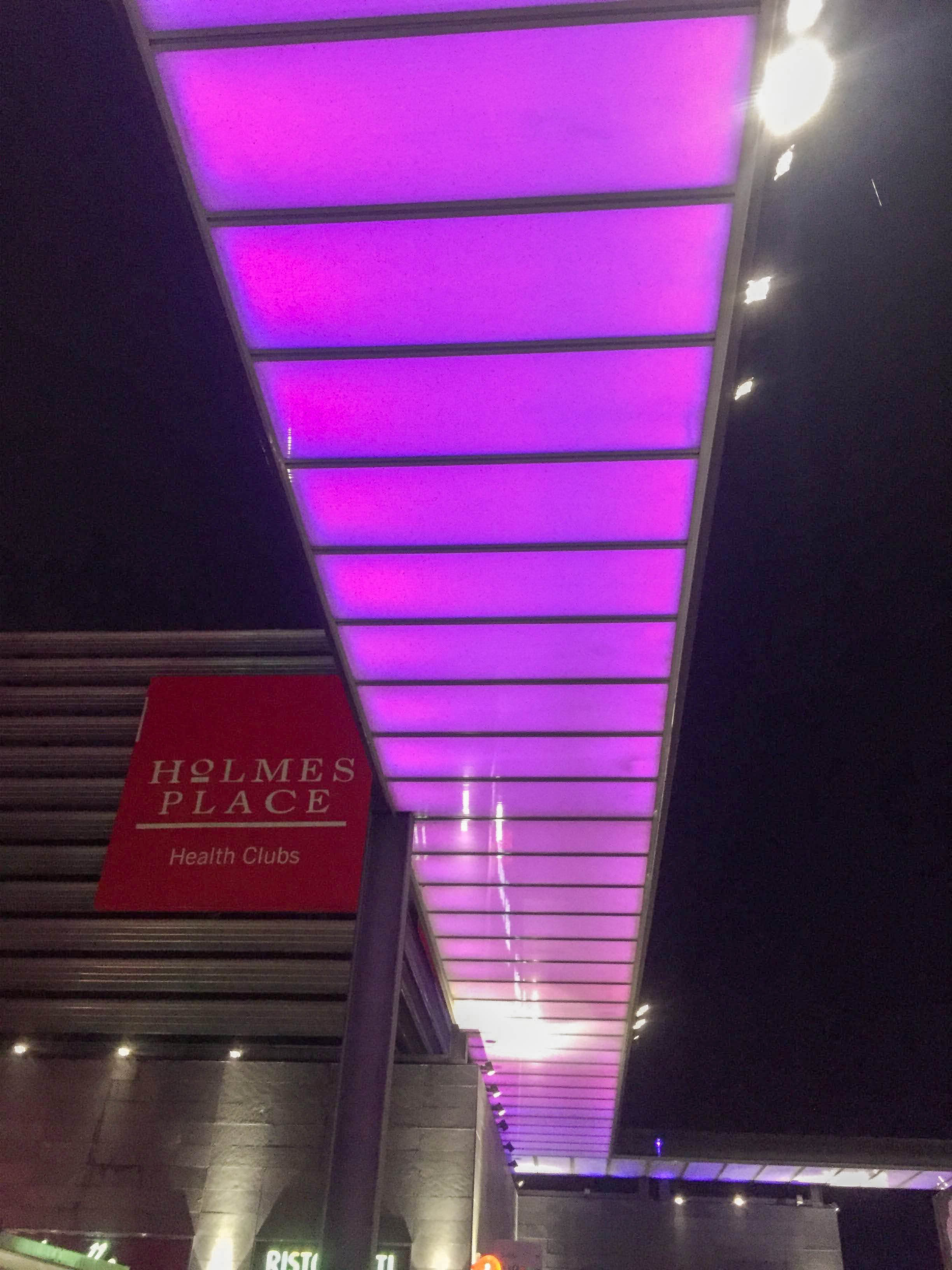 Se instalaron Placas de Policarbonato Celular Sumplastecnic de 25 mm de espesor apoyadas en perfilería traslucidas e incoloras con un sistema de retroiluminación que por la noche se enciende